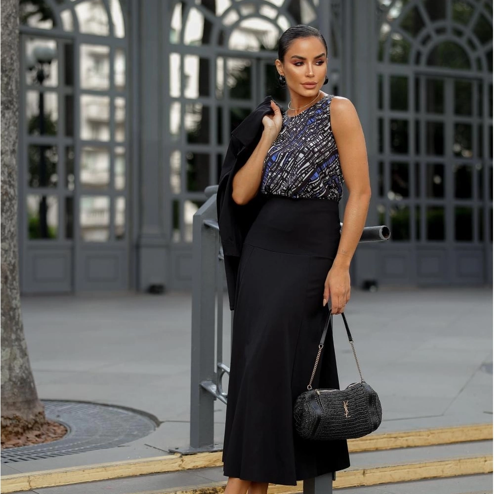 Descrição A blusa Mari, em nossa estampa exclusiva, é a peça perfeita para montar looks diferentes e atuais.Composição: 91% poliéster 9% elastano